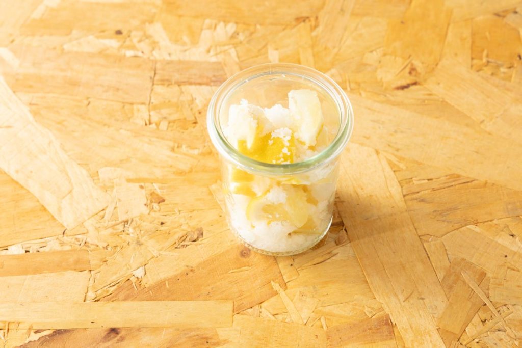 - 保存容器に塩とレモンを交互に入れる。